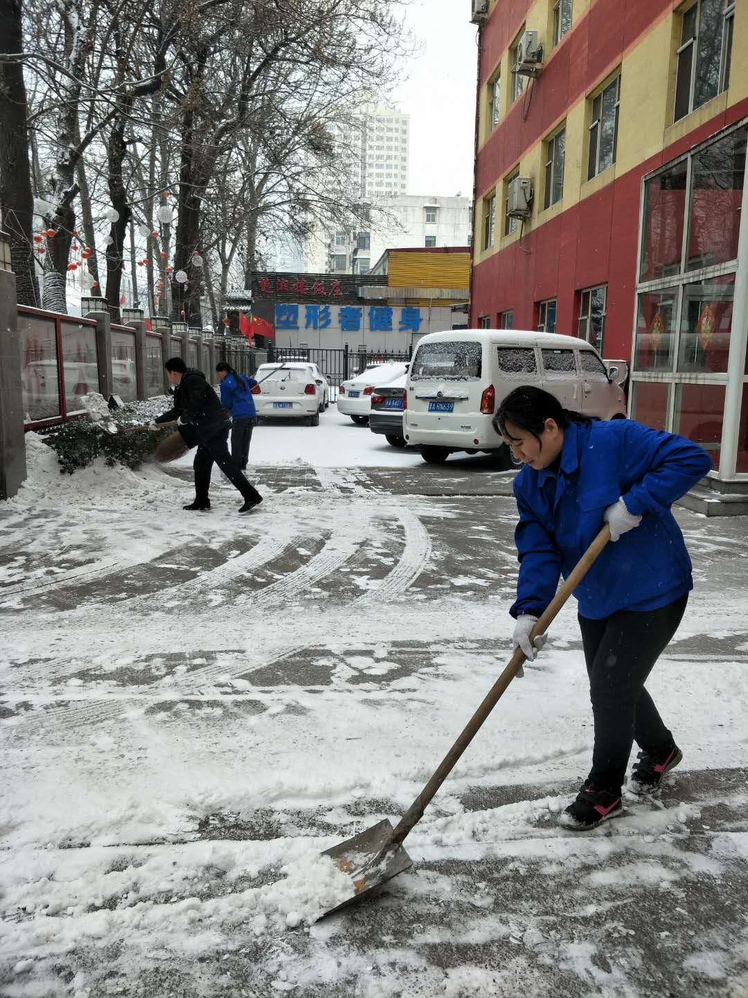 公司管理人員積極組織各項目點員工進行主干道路面清雪(左上圖為晉城職業(yè)技術學院、右上圖為太原體彩中心)