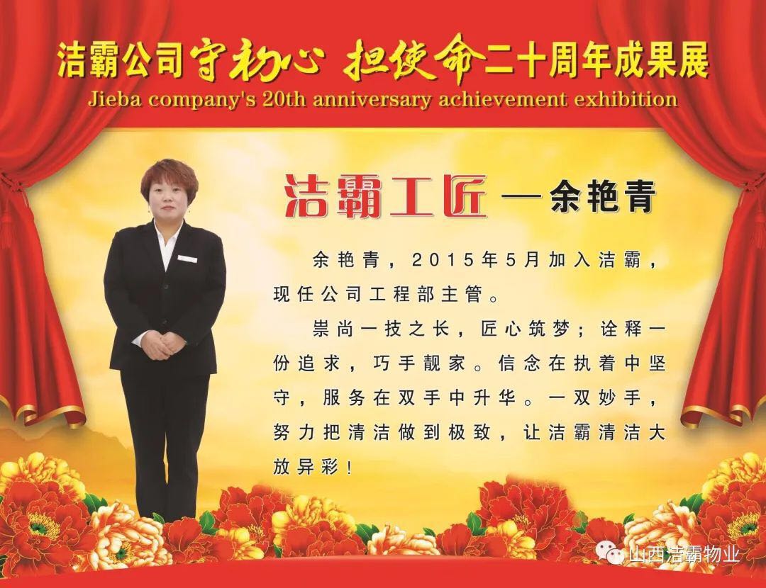 余艷青同志自2015年進(jìn)入潔霸以來,一直奮斗在工程部的第一線從事主管工作。工作中,余艷青同志愛崗敬業(yè),遵守職業(yè)道德,為人誠(chéng)實(shí)守信;她熱愛工作,對(duì)待客戶熱情周到、耐心細(xì)致;工作中團(tuán)結(jié)同事,責(zé)任心強(qiáng),吃苦耐勞,服從大局,以公司的利益為重。在我市開展的“三洗六見一紅旗”活動(dòng)和全國(guó)文明城市的創(chuàng)建活動(dòng)中,她帶領(lǐng)員工高標(biāo)準(zhǔn)、高質(zhì)量、高效率地完成清洗美化工作,為扮靚晉城形象,打造城市優(yōu)美環(huán)境做出了突出貢獻(xiàn)。先后多次被公司評(píng)為優(yōu)秀員工等,2019年在公司成立20周年慶之際,她又被公司授予“潔霸工匠”稱號(hào)。