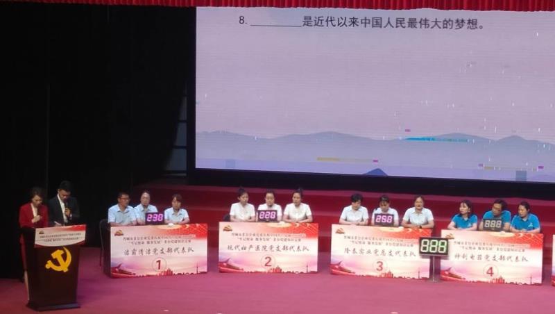 不忘初心跟黨走,牢記使命譜華章!為了慶祝中國共產(chǎn)黨成立99周年,6月28日下午,晉城市非公企業(yè)黨委在澤州天泰錦辰煤業(yè)有限公司職工文化宮進行了一場別開生面的“牢記使命 服務發(fā)展”黨建知識競賽。潔霸清潔黨支部、現(xiàn)代婦產(chǎn)醫(yī)院黨支部、隆泰實業(yè)黨總支、神利電器黨支部、眾宸工貿黨支部和蔬菜公司黨支部等六支代表隊在此激戰(zhàn)正酣,各代表隊你追我趕,斗志昂揚,不甘落后,力爭上游,最終,我公司支部代表隊榮獲比賽三等獎。