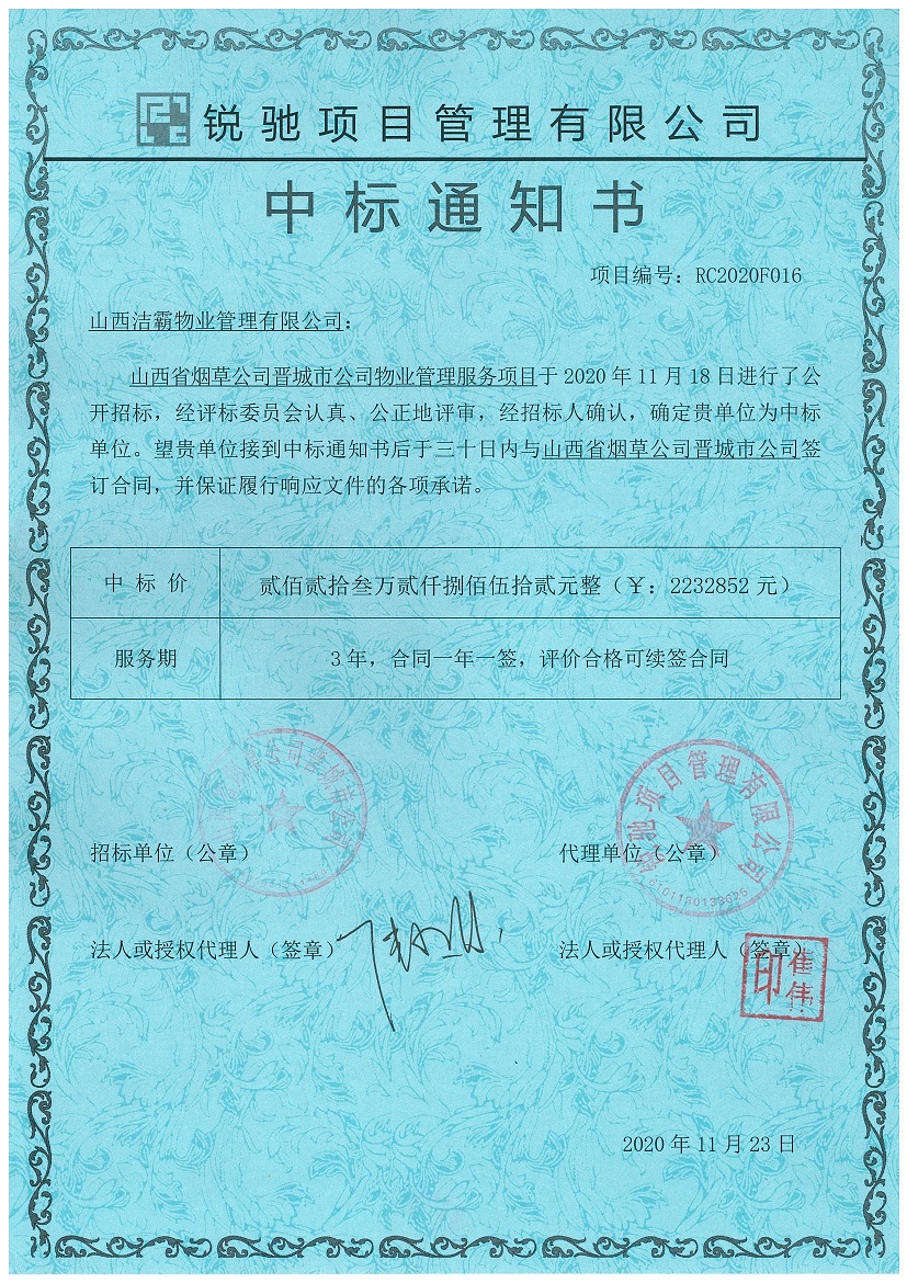 2020年11月18日,山西省煙草公司晉城公司物業(yè)管理服務(wù)項(xiàng)目開標(biāo)會(huì)議在晉城市文昌東街1560號(hào)南環(huán)供電營(yíng)業(yè)站一樓東會(huì)議室舉行。在經(jīng)過幾個(gè)小時(shí)的激烈競(jìng)標(biāo)過程評(píng)選后,從開標(biāo)室傳出喜訊,山西潔霸物業(yè)管理有限公司成功中標(biāo)。中標(biāo)金額為2232852元,合同期一年。此次中標(biāo)為潔霸物業(yè)今年的業(yè)績(jī)?cè)偬硪还P輝煌。