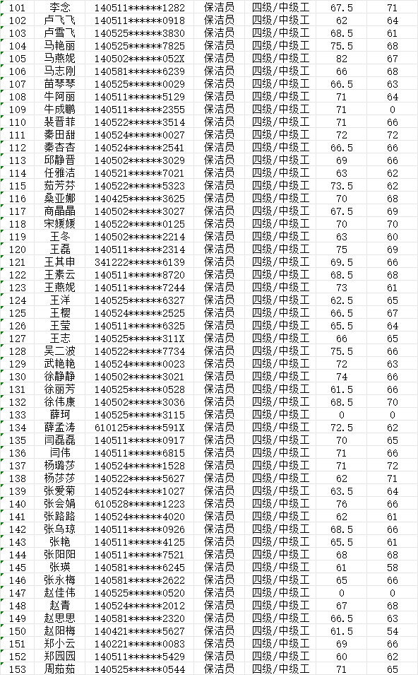 晉城市潔霸清潔服務(wù)股份有限公司職業(yè)技能等級認(rèn)定中心現(xiàn)將2024年1月28日認(rèn)定人員成績公示如下: