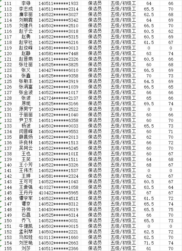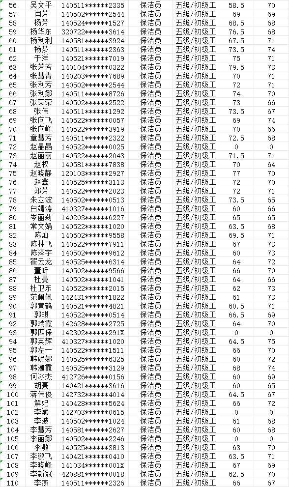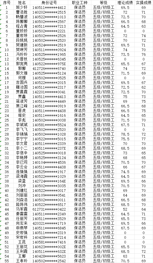 晉城市潔霸清潔服務(wù)股份有限公司職業(yè)技能等級(jí)認(rèn)定中心現(xiàn)將2024年7月27日認(rèn)定人員成績(jī)公示如下: