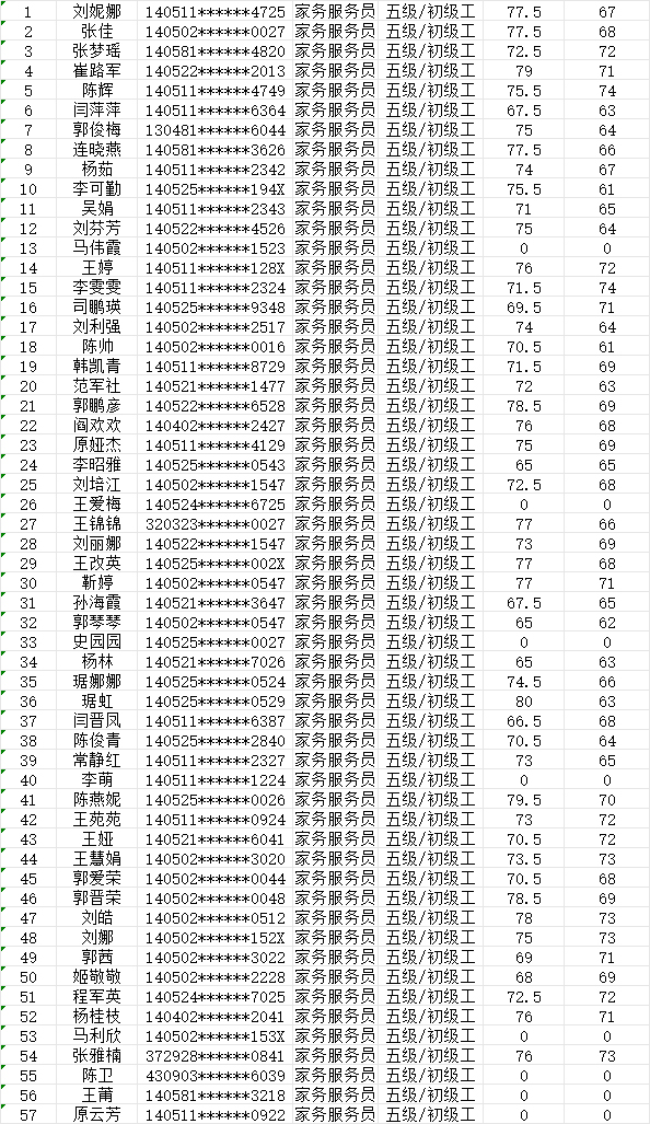 晉城市潔霸清潔服務(wù)股份有限公司職業(yè)技能等級認(rèn)定中心2024年9月21日第39批家政服務(wù)員初級認(rèn)定人員成績公示