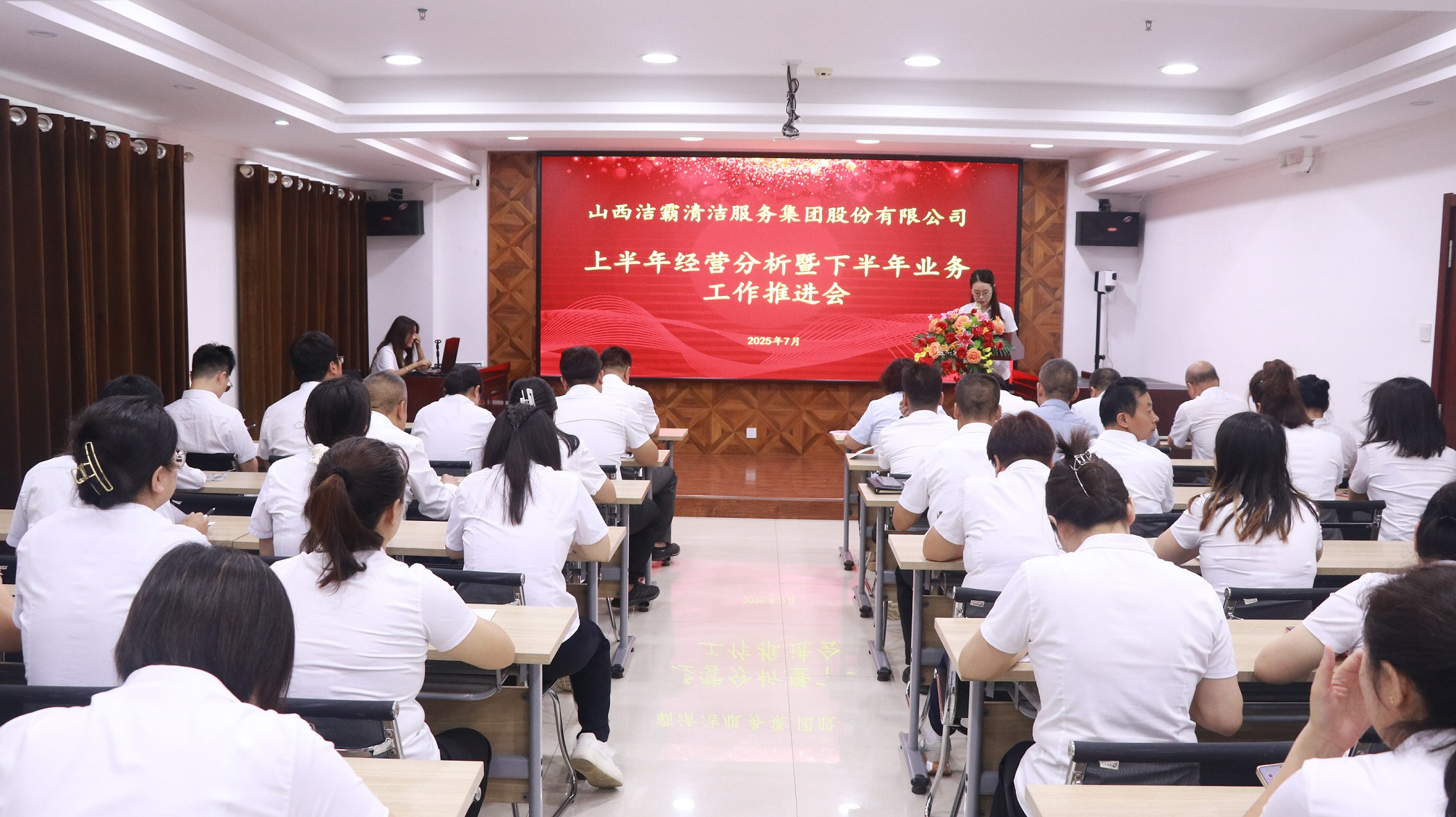 合眾力、潔霸物業(yè)、城區(qū)保安、保潔部、潔霸超市、百潔物業(yè)、培訓學校、智能科技等公司及部門分別圍繞上半年主要經營指標完成情況、新增業(yè)務項目及運營情況、存在的各種問題及改進措施、下半年工作計劃、工作創(chuàng)新思路等情況作了現(xiàn)場匯報。人力資源部、綜合辦公室和財務部也分別就上半年的工作作了匯報。
